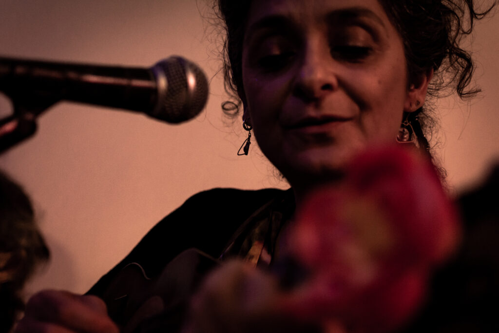 I primi suoni brasiliani le arrivano in una musicassetta ‘senza i titoli’ registrata da un amico. Da allora il percorso vocale è improbabile, dal canto gregoriano all’improvvisazione, da Monteverdi a Brechtiano, dal canto indiano al canto armonico. Nel frattempo ascolta altre musicassette, direttamente dal Brasile stavolta: la coinquilina Belohorizontina le fa conoscere Caetano Veloso, e Elis Regina. Continua ad ascoltare. Si laurea, si arrabatta di qua e di là. Il Brasile ricompare a tempo perso, a suon di batucada, di ritmi di percussioni. Poi tira fuori quei vecchi brani che ascoltava, li propone alle amiche, poi agli amici, poi ad altri amici. E adesso, a questi amici qui, gli amici di Abraço Branco